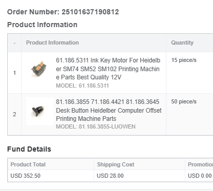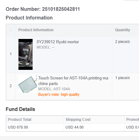 Número de pedido: 25101825042811 a piezas de máquina de impresión de Indonesia
